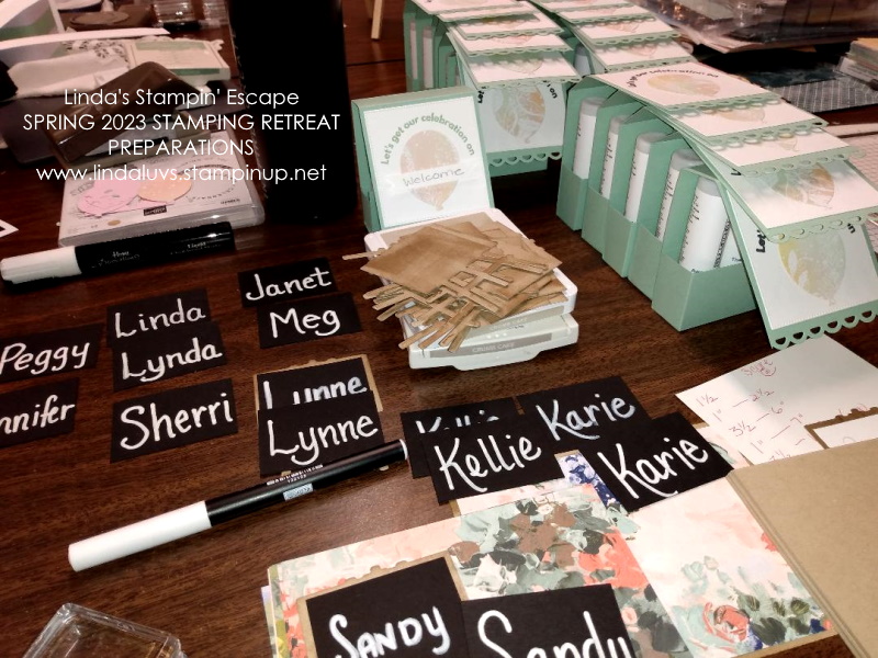 Not only do I design and cut cards for retreat but we create special gifts for our guests … here I am working on the name tags and welcome gifts.