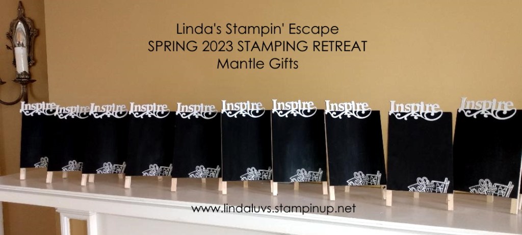 The Mantle Gifts …. each retreat we decorate the mantle with a cute little gift that highlights a product out of the catalog. For this one I used the Cheerful Basket Bundle. I’m going to miss that “crafting” stamp for sure … it retires and today is the last day to purchase it before it’s gone.