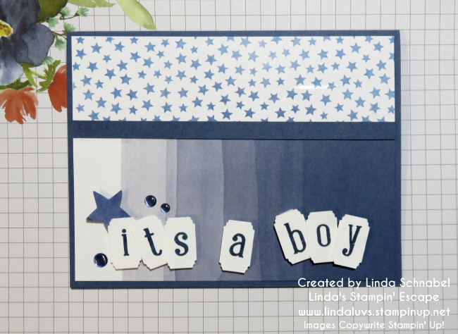 I created my greeting using the Alphabest stamp set and coordinating punch. I used Misty Moonlight ink to stamp the Its a Boy onto a piece of Thick White Cardstock and then punched out the each of the letters ….