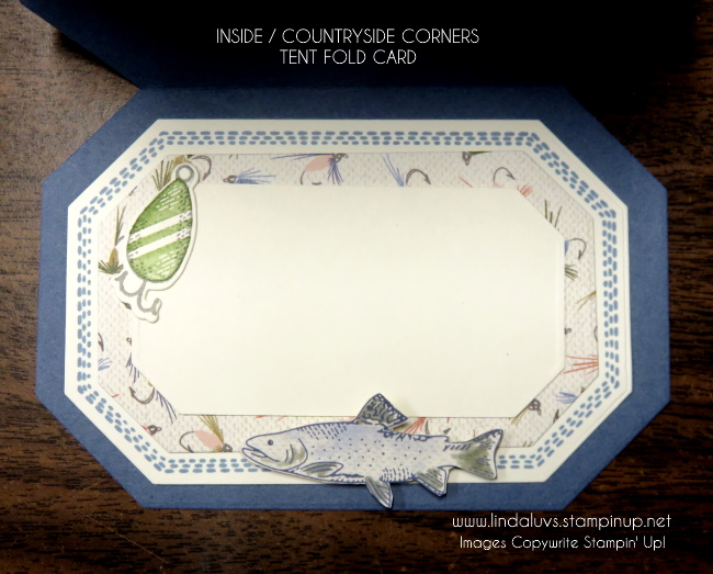 Today I want to share the Perfect Man Card with you … It’s got “Gone Fishing” and a Fun Fold to boot! It is the Tent Fold created with the Countryside Corners Dies. I know I’ve share this pattern before so today, just comment below and I will send you the PDF with color pictures, all the dimensions and step by step instructions.