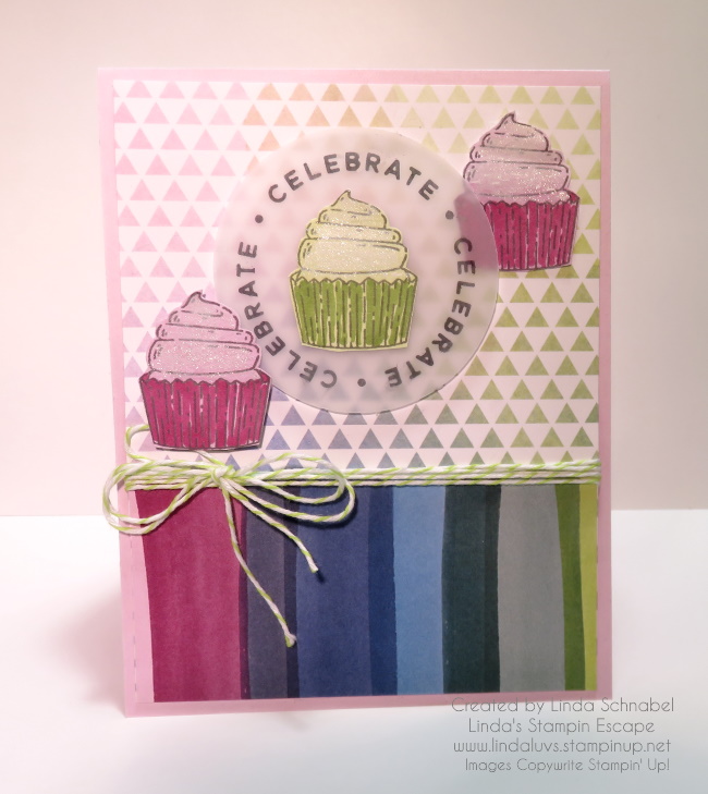 The pink cupcake in the lower left-hand corner was popped up, and the one in the upper right-hand corner was tucked under the vellum and secured directly onto the card front.