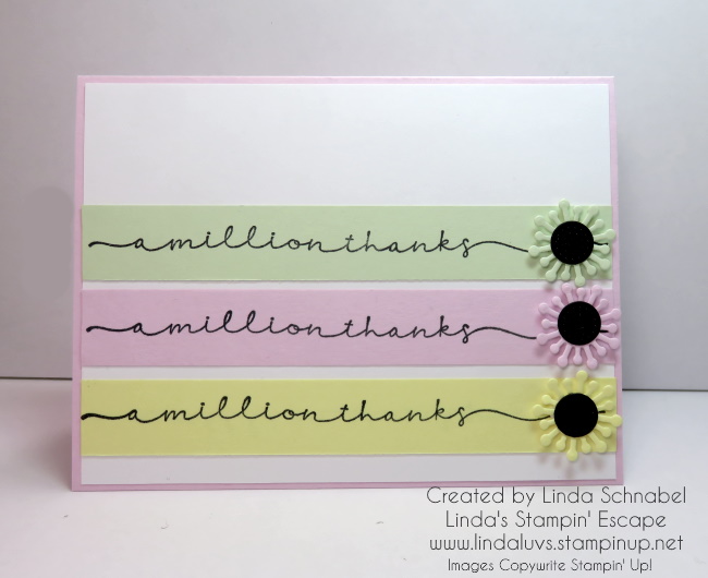 For today’s project, I’ve showcased the charm of the Sweetly Scripted stamp set by creating a simple yet impactful card. Using our Soft Subtles colors in 3/4″ x 5 1/4″ strips of – Bubble Bath, Lemon Lolly, and Soft Sea Foam – I’ve created a soft and soothing palette that perfectly complements the tender sentiments of the stamps by stamping the phrase “A Million Thanks” using Memento Ink. Its crisp black hue pops beautifully against the pastel background, conveying our gratitude in a bold and elegant manner.