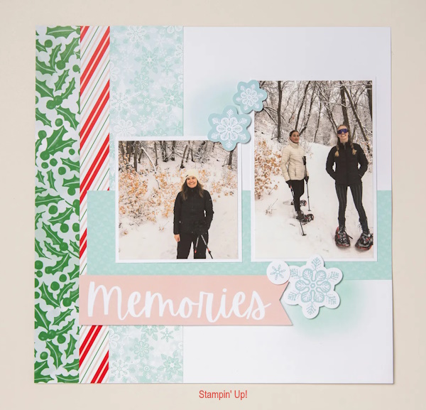 This kit includes supplies to create three predesigned two-page scrapbook spreads. Each page is 12″ x 12″, allowing lots of space for photos and journaling. The whimsical color palette is a fresh take on classic winter patterns. Here is just one pages ….