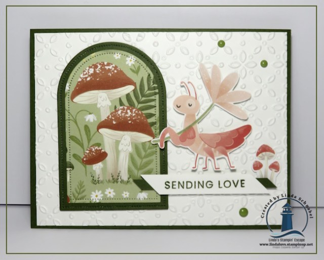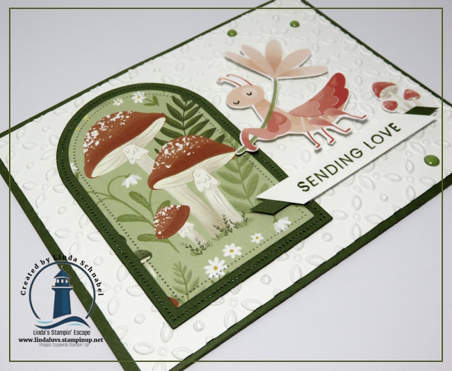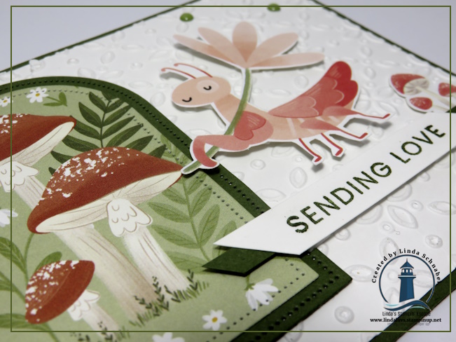 Now let’s talk about that sweet little bug, because she truly steals the show. She was fussy cut from a second pattern in the Cute as a Bug Designer Series Paper, and I couldn’t resist placing her right beside the mushroom arch. With her daisy held high, I can’t help but wonder—do you think she’s using it as an umbrella? That tiny detail adds so much personality and makes the card feel like it’s telling a story rather than just displaying images.