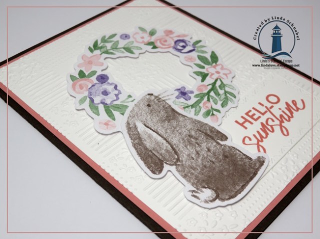 The layers for this card are clean and classic, creating the perfect base for our spring focal point. The A2 card base is Early Espresso, measuring 8 1/2″ x 5 1/2″ and scored at 4 1/4″. I added a Flirty Flamingo mat cut to 5 1/4″ x 4″, followed by embossed Basic White at 5 1/8″ x 4 7/8″. These simple layers frame the ephemera beautifully and allow the soft spring colors to really stand out. If you enjoy designs that are easy to recreate but still have that “wow” factor, this layout is one you’ll want to save.