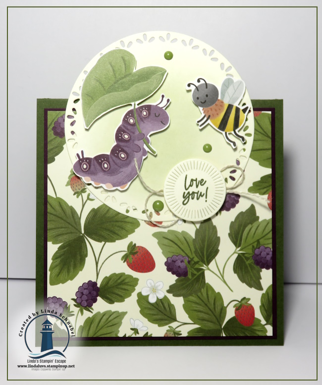 For today’s card, I leaned into the whimsy of the paper and let those darling images do the talking. From the smiling bee and butterfly to the lush leaves and berries, every layer adds to the charm without feeling fussy or overdone. The fun fold design gives this card a little “wow” when it’s opened, yet it’s still simple enough to recreate—perfect for when you want something special without a lot of extra steps.