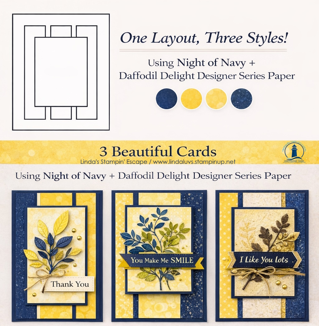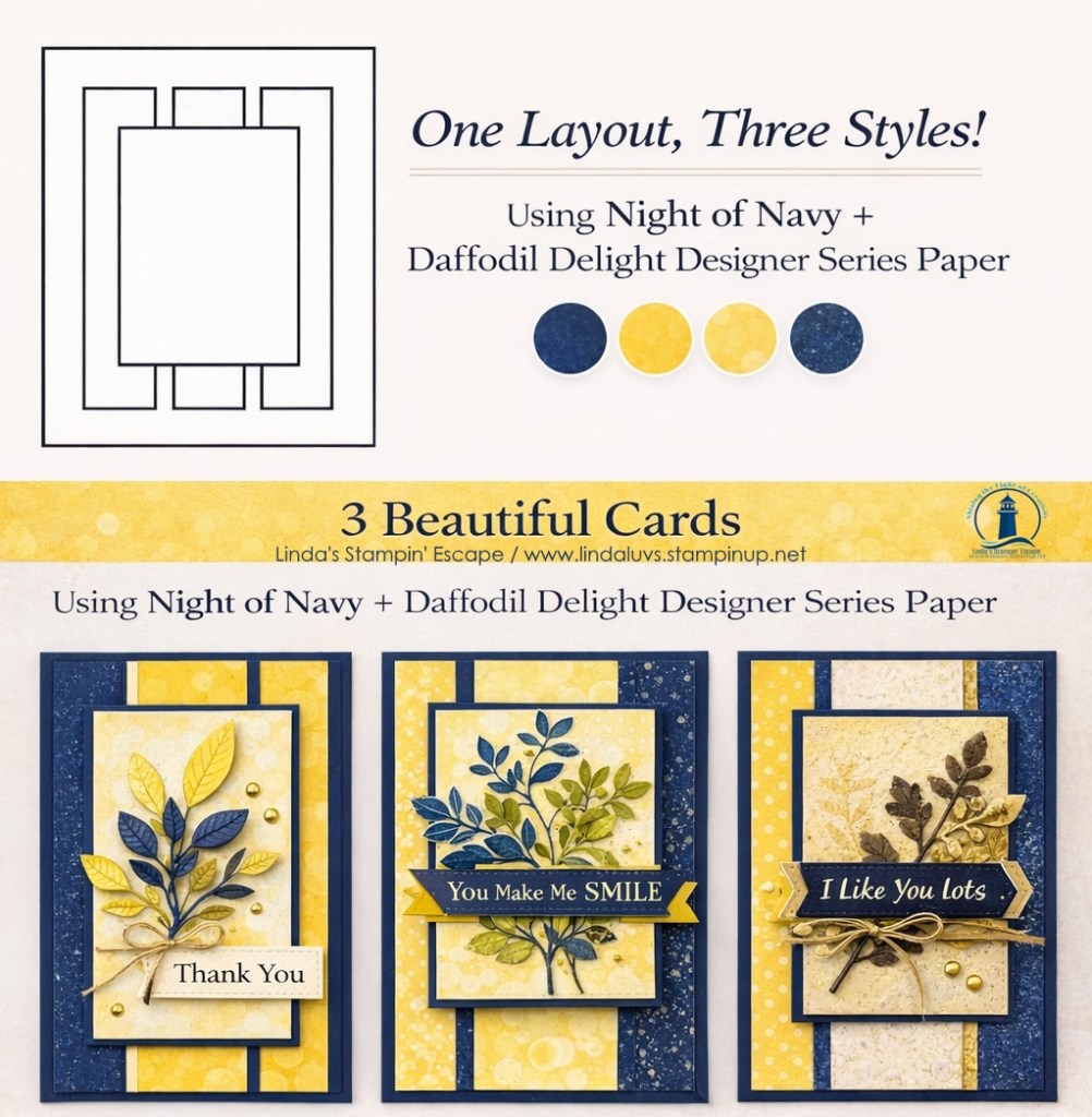 I just love showing how one simple layout can completely transform depending on the Designer Series Paper you choose! 💙💛 These cards highlight the Nature’s Symphony bundle … it’s perfect for all and any occasion.