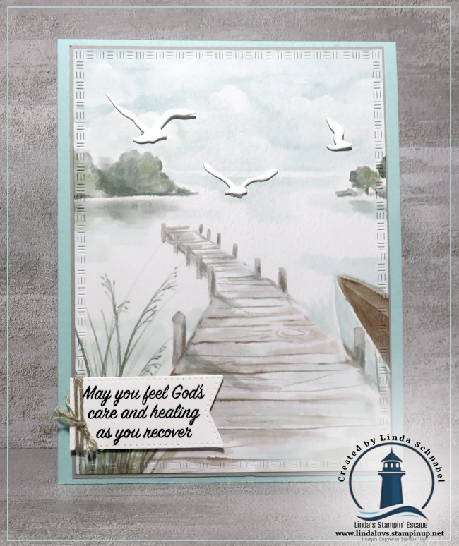Today, I’m delighted to share a handmade card inspired by this tranquil collection. My card highlights the stunning designer paper, which beautifully depicts a misty lakeside dock scene, instantly setting a peaceful and reflective tone. To enhance the sense of movement and life, I added delicate bird dies soaring across the sky, bringing dimension and a touch of nature to the card. The sentiment, created using the Prayers & Promises stamp set, offers a message of comfort and healing: “May you feel God’s care and healing as you recover.” This makes the card especially meaningful for sending encouragement during times when a gentle reminder of care is needed.