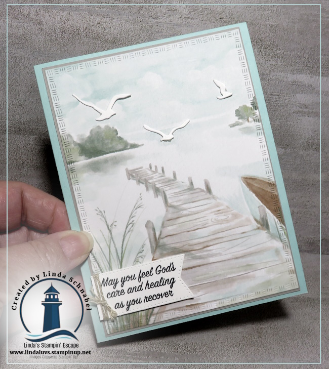 Today, I’m delighted to share a handmade card inspired by this tranquil collection. My card highlights the stunning designer paper, which beautifully depicts a misty lakeside dock scene, instantly setting a peaceful and reflective tone. To enhance the sense of movement and life, I added delicate bird dies soaring across the sky, bringing dimension and a touch of nature to the card. The sentiment, created using the Prayers & Promises stamp set, offers a message of comfort and healing: “May you feel God’s care and healing as you recover.” This makes the card especially meaningful for sending encouragement during times when a gentle reminder of care is needed.