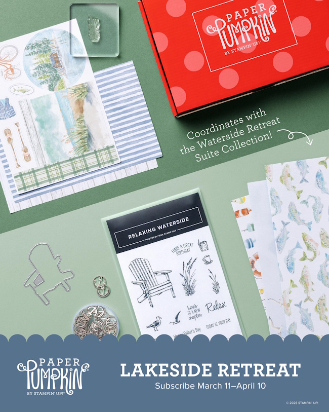 Thank you for stopping by today. I hope this card inspires you to take a moment for yourself and enjoy the peaceful creativity that stamping brings. Be sure to subscribe to Paper Pumpkin before the day ends, and get ready to create your own lakeside escape!