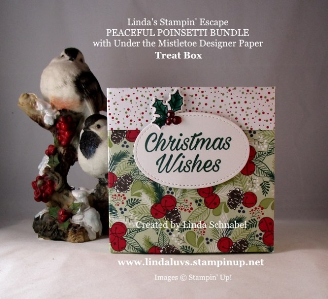 I used the middle size die and stamped the Holly swag onto it. The holly was colored with the Watercolor Pencil Assortment 2 which are available with the Blended Season stamp set and dies. The designer paper is the Under the Mistletoe and is the driver of my color pallet.