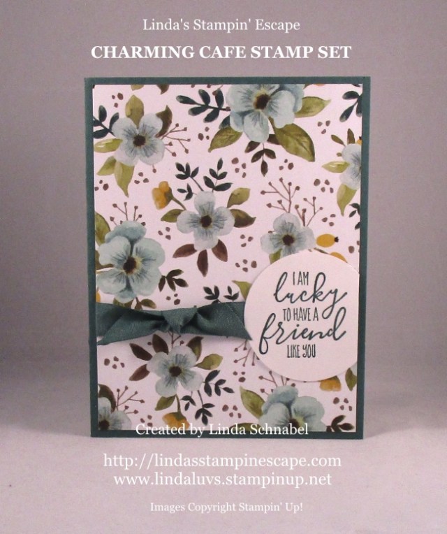 Simplicity at it’s finest … the core of your card is a 4″ x 5-1/4″ sheet of designer paper. My greeting comes for the beautiful “Charming Café” stamp set found in our Occasions catalog and punched out using the 2″ Circle Punch.