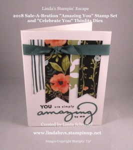 I added the “Tranquil Tide” ribbon for my bow. I also used the Tranquil Tide cardstock to cut out my “amazing” from the exclusive 2018 Sale-A-Bration “Celebrate You Thinlits Dies” and “Amazing You” Stamp Set!