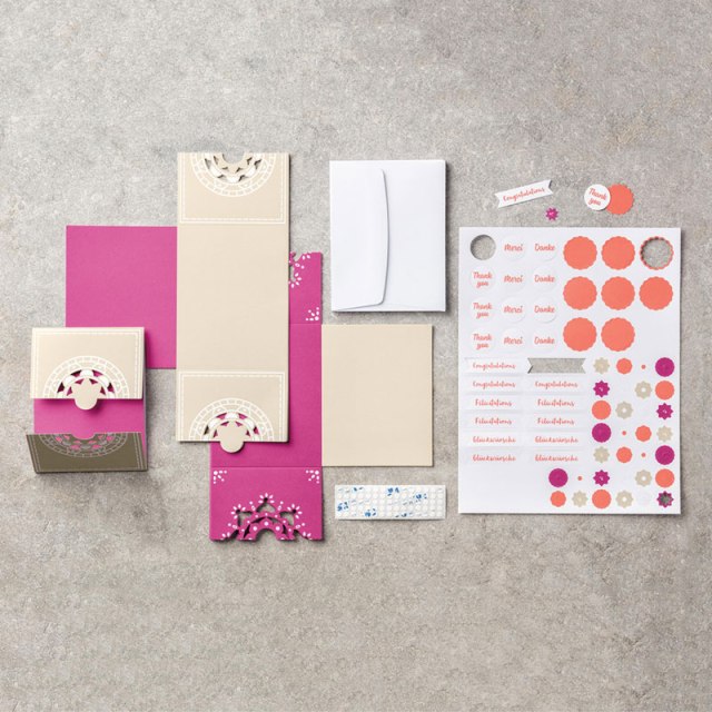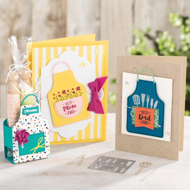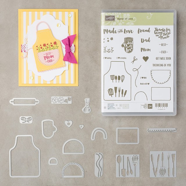 The bundle includes 24 photopolymer stamps with * Suggested clear blocks (not included): a, b, e, g. You’ll create die-cut aprons with utensils in record time with 17 Framelits dies to use with your Big Shot.