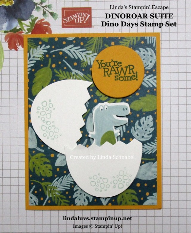 These guys are soooo cute, you will most definitely want to team this bundle up with the Dinoroar designer paper: 149589. This is a Stampin’ Up! card …