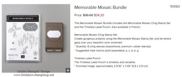 You may also want to add the amazing Mosaic Mood Specialty Designer Series Paper (149478) It’s mosaic tile designs and floral imagery with shiny, transparent accents is the “cherry on top” to this bundle! The background on this card … and the bird are from this designer paper.
