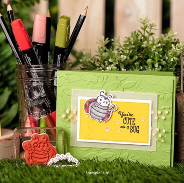 Today I’d like to share some cute cards and a quick video on our NEW Little Ladybug Stamp Set. Grab a cup of coffee and join me for some fun stamping tips! Why the rush on the Little Ladybug … because next month Stampin’ Up! is offering “Coordination Products” so there will be dies to coordinate with our ladybug, more on that down further on this post. Ready …