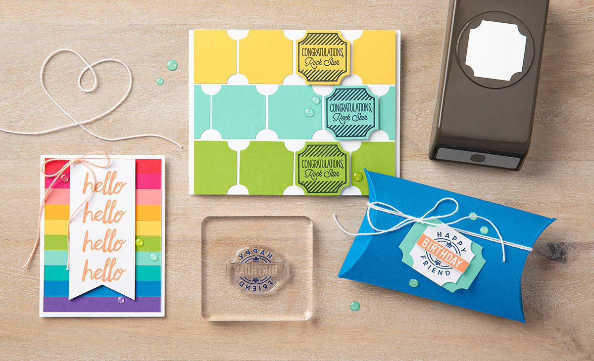 These projects highlight both the stamps and the punch. How clever to use the punch to create a background!! I also love the colorful background made up with scrap piece of cardstock and then utilizing the “hello” stamp that is included in the stamp set that’s included in your beautiful tin.