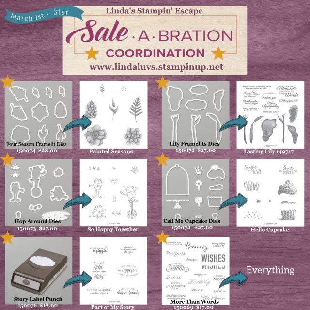 I’m happy to say good-bye to February and it’s crazy weather and hello to March with all it’s marvelous stampin’ deals!! It’s our last month of Sale-a-bration and Stampin’ Up! put the cherry on top by adding coordinating thinlits for your favorite Sale-a-bration items, and that’s not all, they’re introducing MORE items to the Sale-a-bration rewards 🙂