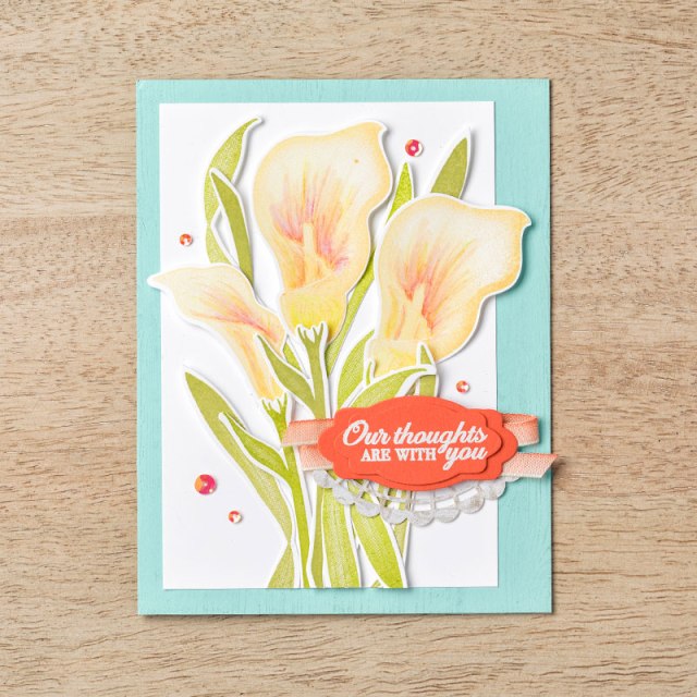 Here are a few samples created using the Sale-a-bration sets with their coordinating dies … Let’s begin with the beautiful Lasting Lily Stamp Set and coordinating Lily Framelits Dies. The dies make layering your lilies so easy and creates a stunning card with dimension and texture.