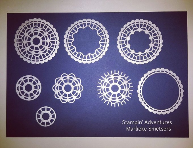 One of the items that is now available for SAB are the beautiful Pearlized Doilies … Love these! Even gave them as part of the gift package at last years spring retreat. This comes from fellow demonstrator Marlieke Smetsers!! Oh my gosh, this is so clever … look at all the different patterns Marlieke created using the Pearlized Doilies!! You could use them to highlight a greeting … as snowflakes … to embellish a part of your card, the possibilities are endless.