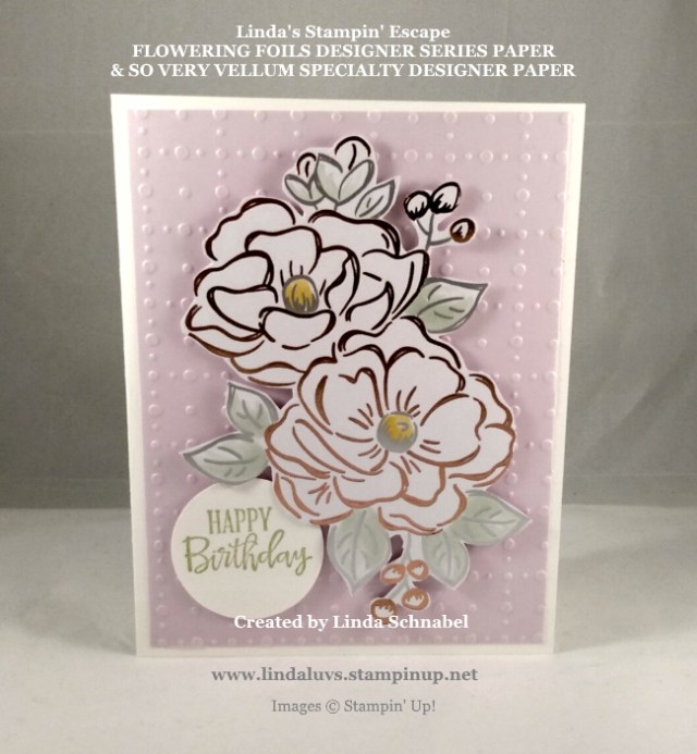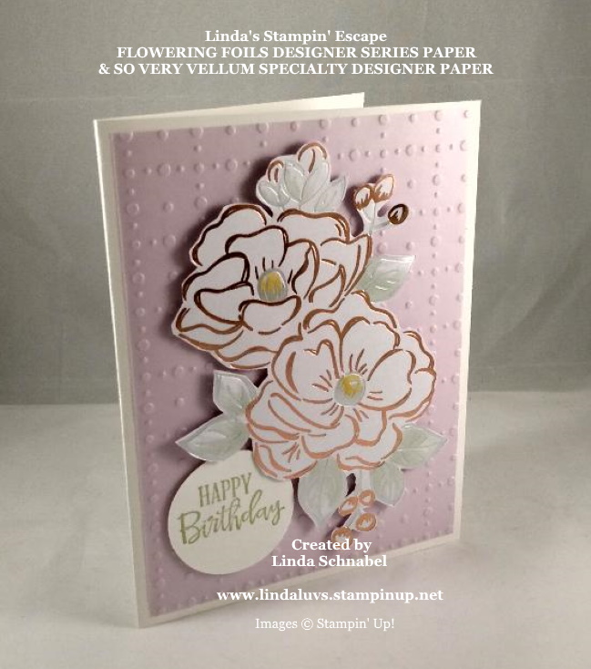 My second card does a 180 from the masculine to a more feminine card. This card highlights the So Very Vellum Designer paper and is teamed up with the “Best Dressed” Designer Series paper …