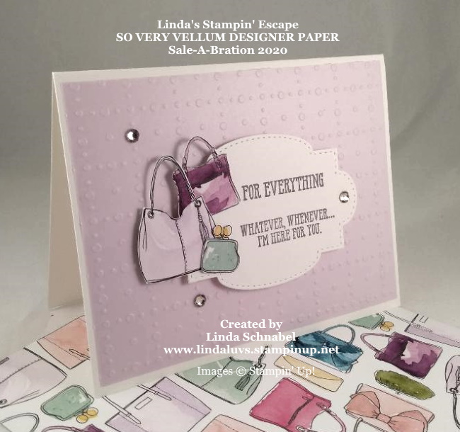 As I stated earlier, both cards used the “Well Said” stamp set for my sentiments. This card reflects a special thank you “for everything” you do … I’m here for you as well. The cute little handbags were fussy cut from the designer paper which you see in the foreground.