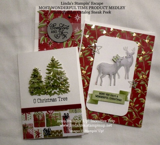 Here are the three cards that we made during our Make & Take session yesterday morning. I love how cute the Christmas tree’s look with the tinsel trim and the designer paper with the “gold” that glimmers so beautifully ….