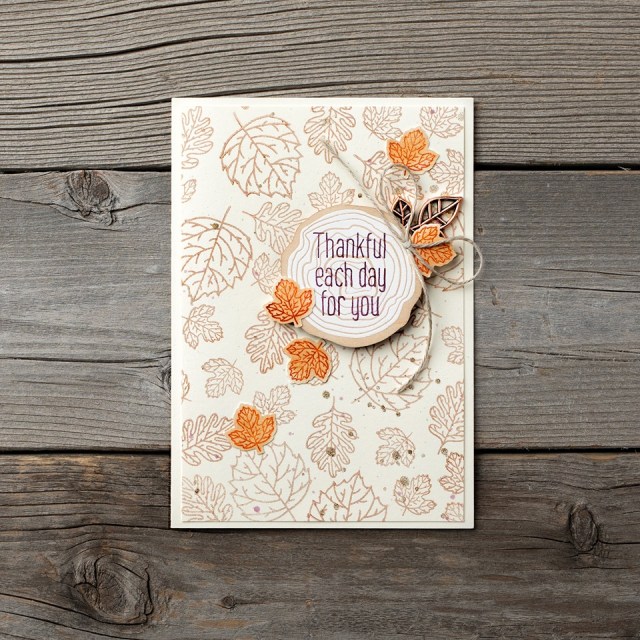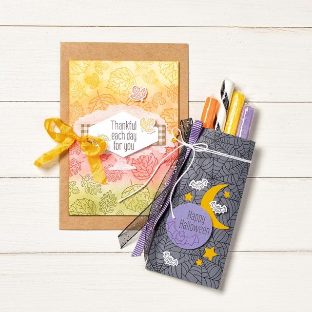 Both of today’s cards were “jazzed” up with my Stampin’ Blends! My first card is a fun Autumn card and I used the Pumpkin Pie Stampin’ Blends to add a strip of color between the stripes on the designer paper ….
