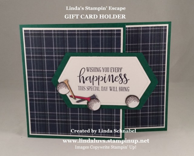 I don’t really have anyone in my family that golfs, but that never stopped me from getting a designer paper!! I love the plaid design … and if you flip it over, you’ll see a background of golf balls and tee’s! Yes, I cut those out too … the tee’s that is. I actually used the 1/2″ circle punch to punch out the gold ball and then just gave it a little trim. Much easier that trying to cut a perfect circle!!