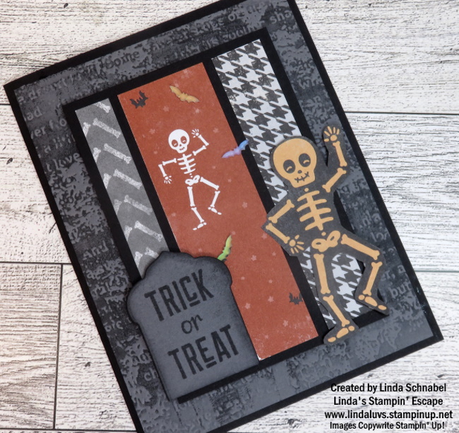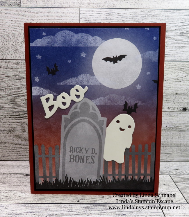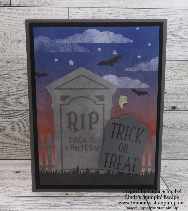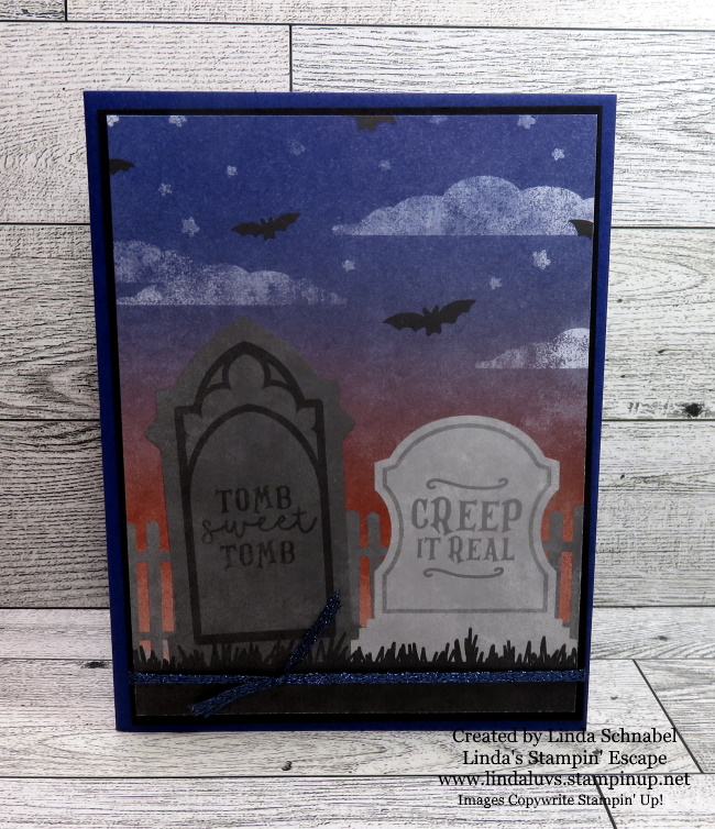 No Halloween card is complete without some creepy critters! I grabbed 3 bats from the sticker sheet and once placed, I tucked a dimensional under one of the wings on each bat. This simple technique makes them look like theyāre flying right off the card!