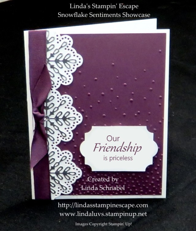 Don’t let the “snowflake” in the name fool you… I used them along with the lacy background to create a soft feminine card to let my friend know “her friendship is priceless”.