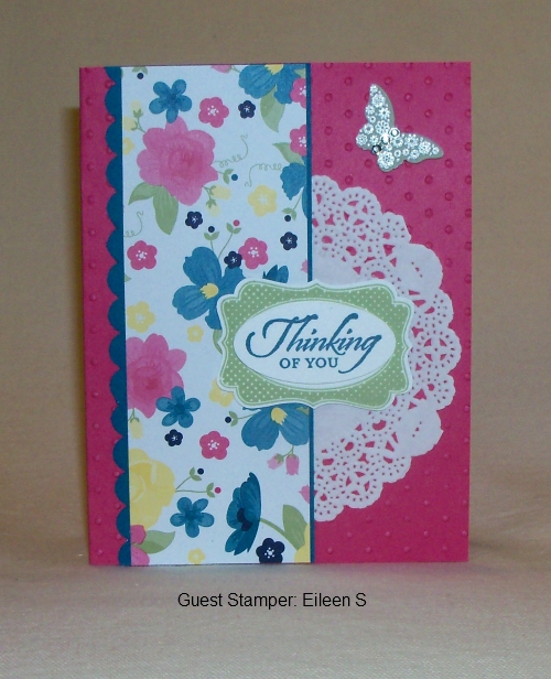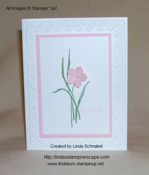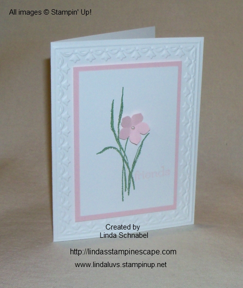 To balance the color and draw your eye to the greeting, I punched out a small flower from the “Itty Bitty Shapes” trio punches (On the retirement list) also in Pink Pirouette. Both of these items were embellished with the beautiful Rhinestones. I hope they NEVER retire those … I love them and use them all the time!