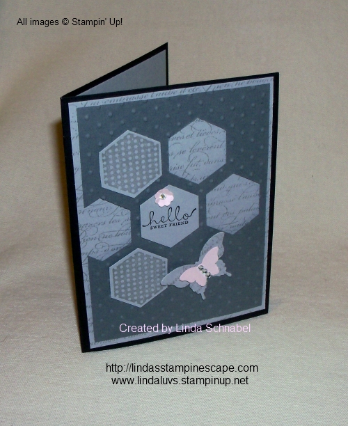 Using the Six-Sided Sampler stamp set, I stamped a couple of images and my greetings onto the Smoky Slate. Then used the Hexagon punch to punch them out. The punched images were placed around the punched areas on the Basic Gray… the greeting was popped up with Stampin’ Dimensionals.