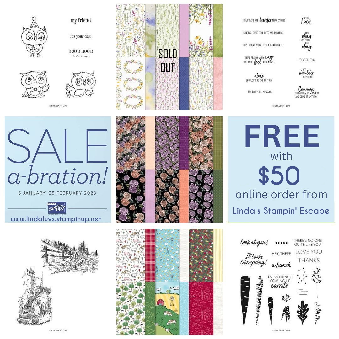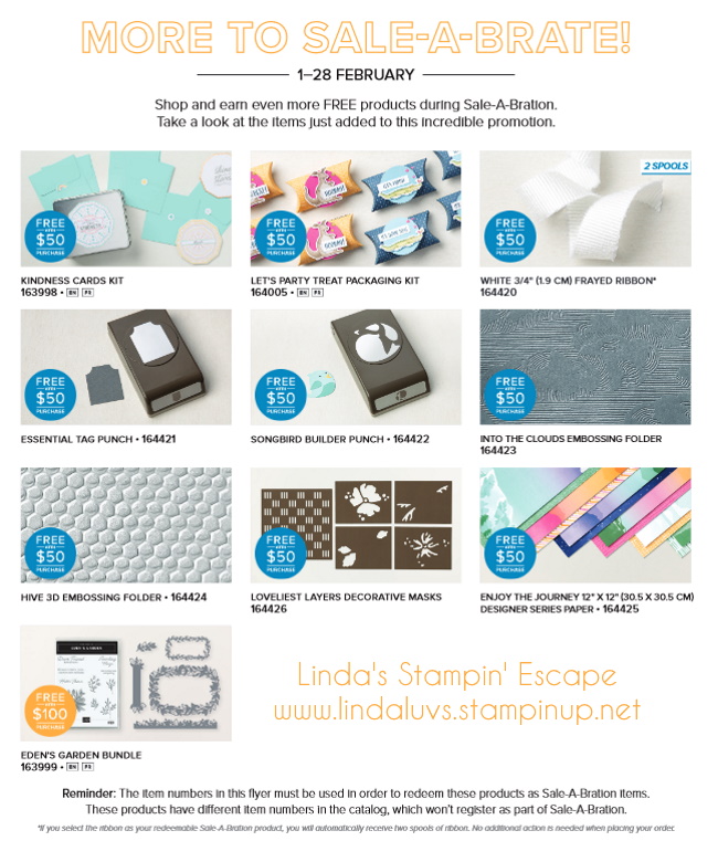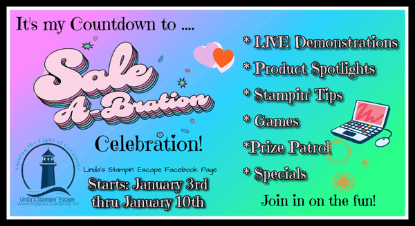 Join me TODAY as we kick off Linda’s Stampin’ Escape Sale-a-bration Party — On my Facebook page! It’s 7 full days of FUN, GAMES, PRIZES, SPECIALS, and Live Demonstrations! 🎁✨