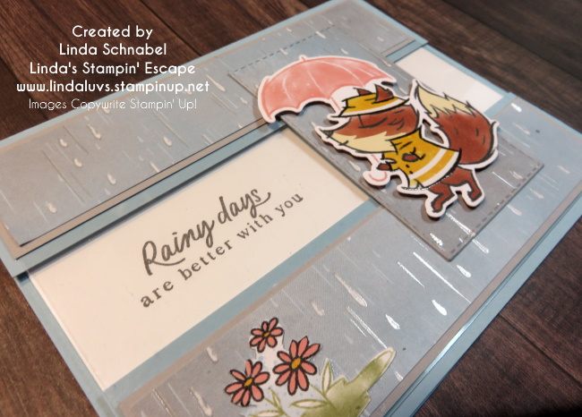 And this happy fox doesn’t seem to let that stormy weather bother him at all. I fussy cut the flowers out again because I wanted a touch of pink in the card to coordinate with the umbrella and to create a better flow on my card. I changed the greeting as well … and I agree, rainy days are always better when your with people you care about.