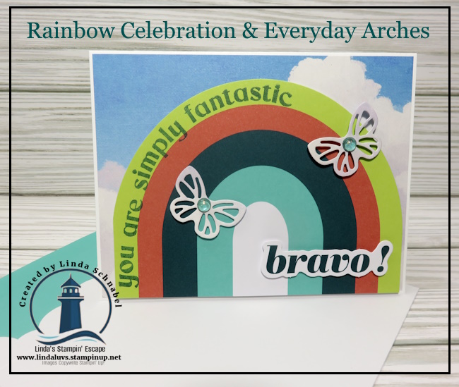 When I first saw the Rainbow Celebration Sale-a-Bration kit, (FREE with qualifying purchase) my creative gears started turning. Could the cheerful rainbows and bold colors from Rainbow Celebration combine beautifully with the graceful arches and sentiments of the Everyday Arches bundle? The answer was a resounding “YES!”