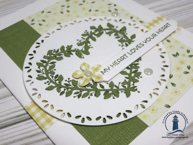 The floral heart image was stamped using a Old Olive ink and the die cut heart was done in the same color. I chose the “My Heart Loves Your Heart” sentiment, stamping it in Old Olive making everything coordinate, and tie it all together.