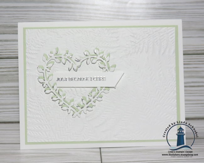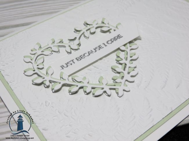 The background was embossed with the Fern 3-D Embossing Folder to create a soft texture. The “Just Because I Care” sentiment fit was tucked inside the heart, and I heat-embossed it in Silver for a touch of shine. The layered hearts and embossed sentiment creates a simply elegant card brimming with texture.
