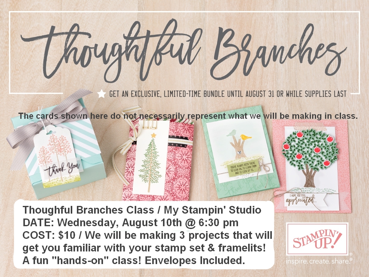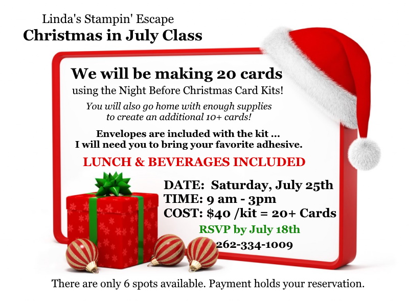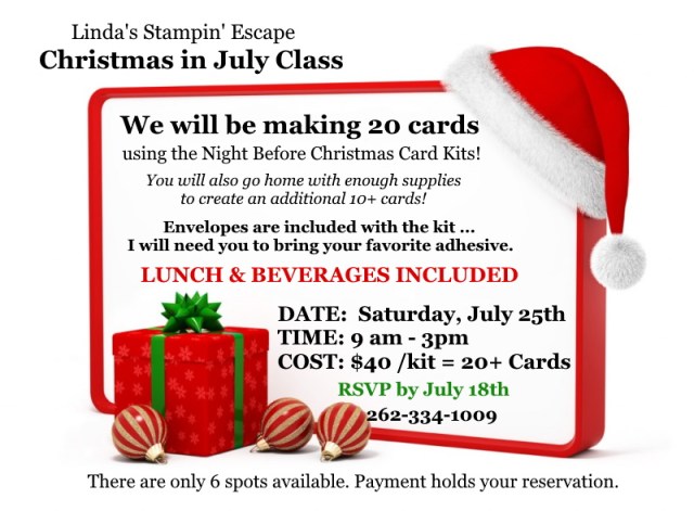 Join me for an delightful day getting a jump on your Christmas cards this July! Your packets will contain everything (and more) to create the 20 cards in this class… PLUS, you’ll go home with enough supplies to make another 10 or more cards!!