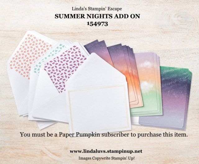 What’s even more spectacular about July’s kit is the add-on you can purchase along with it! The Summer Nights Add-On includes 24 card bases and envelopes in coordinating Summer Nights designs. This add-on is perfect for helping you expand the Summer Nights creative experience beyond the Paper Pumpkin kit. Between the add-on and the leftover supplies from your Summer Nights kit, you will be crafting a summer night worth celebrating all month long!