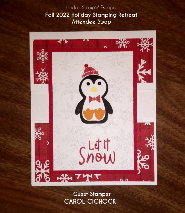 This cute holiday card features the Penguin Builder Punch and a Fun Fold! Carol used the Split Panel card / technique. It’s pretty simple. You cut your card stock base 7-1/2″ x 4-1/4″ and score it at 5-1/2″ Then you cut your bottom panel. You can cut it any size you wish, just make sure you leave enough for an opening in the middle.
