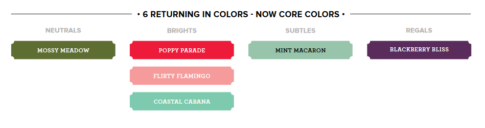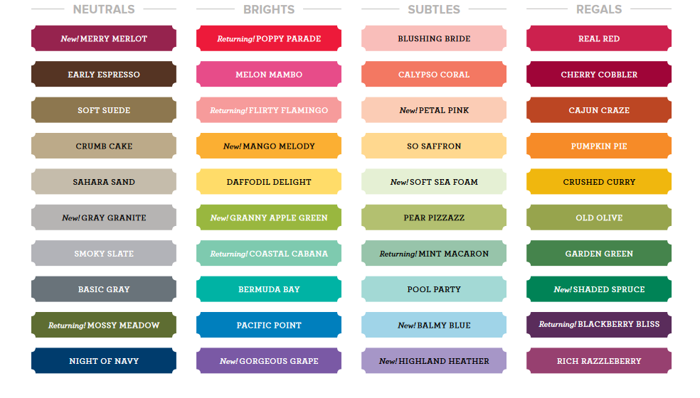 Β It’s so exciting to share the new colors and the revamp with you.Β You have just a few short weeks to pick up those colors that will be retiring but you can also get out your wish list for the beautiful new colors being introduced. I’m happy to see Blackberry Bliss, Mossy Meadow and Poppy Parade return and I can’t wait till you can see such colors like Granny Apple Green, Gorgeous Grape and the new Pineapple Punch … that even sounds yummy!!