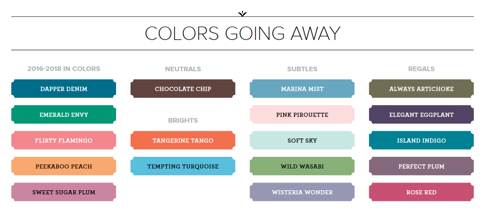 You knew that the 2016-18 Colors were leaving, but with the color revamp … we have a few more. Don’t be sad about those leaving, you still have time to stock up but Don’t forget your INK REFILL!!