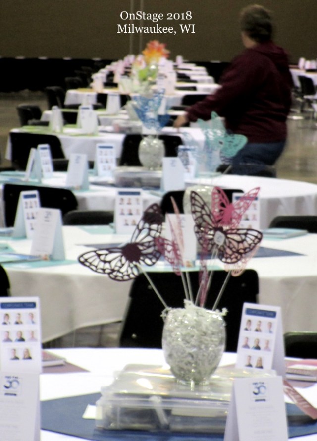 Now as we get seated and the event begins, we were blessed to have Shelli Gardner (Co-Founder of Stampin’ Up!) as our main presenter … we had many great Stampin’ Up! staff presenting in Milwaukee.Β Remember, they are spread out all over the world! Sara … Shelli’s daughter was presenting in Australia!!