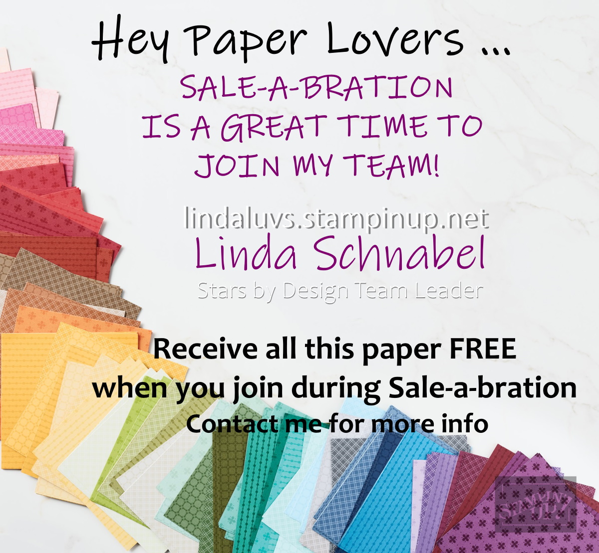 I have a fabulous opportunity for my paper lovers … Now, when you join my stampin’ team and the Stampin’ Up! family you will receive an “Exclusive Gift” from the Upcoming Annual Catalog … you will receive an assortment of 5 stacks of our newest 6″ x 6″ Designer Series papers!!
