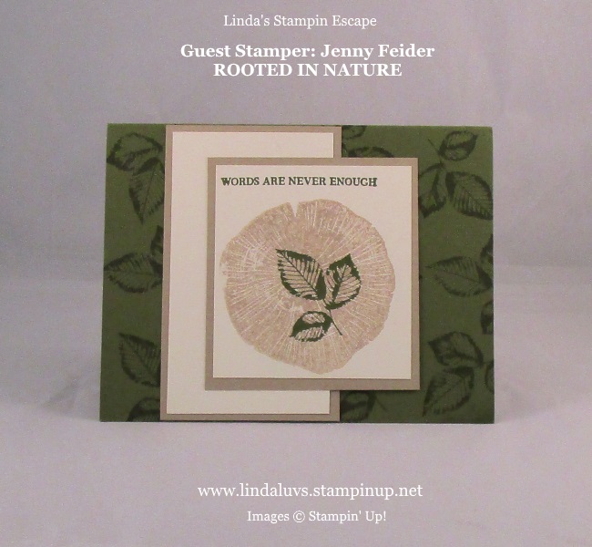 Eileen was also a demonstrator so in the early years before Pinterest and Facebook groups we did a lot of traveling together to meetings, stampin’ events and conventions. So Jenny’s card was to honor Eileen and Jenny … she would have loved it!! Earthy tones and woodsy was right up her alley.