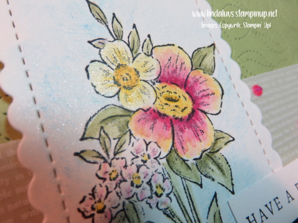 Embossing with the white emboss powder highlights your watercoloring and creates a soft beautiful look … watercoloring within an embossed image is easy and makes YOU look like the artist!! The soft look just pops against this stunning Fresh Freesia foil specialty paper from the Splendid Day Designer Paper. This was attached to the Basic White base is 8-1/2″ x 5-1/2″ scored and folded at 4-1/4″.