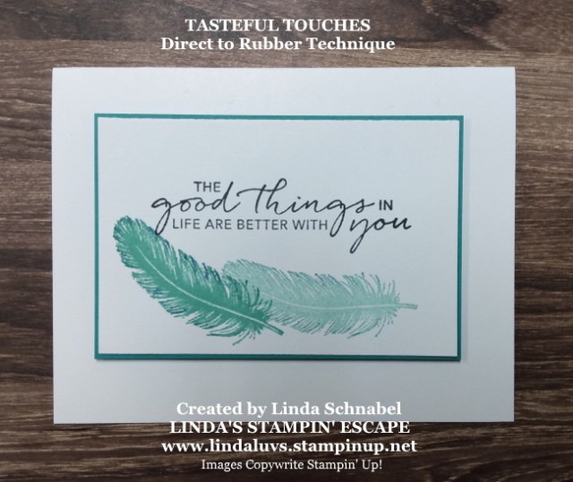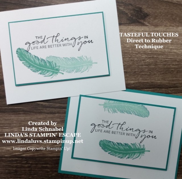 I hope this inspires you to try out the “Spotlighting” technique … feel free to send me your creation, I’d love to share them here on my blog! And I invite you to join me each Tuesday on my Linda’s Stampin’ Escape Facebook page to watch LIVE and get in on the prize drawings …