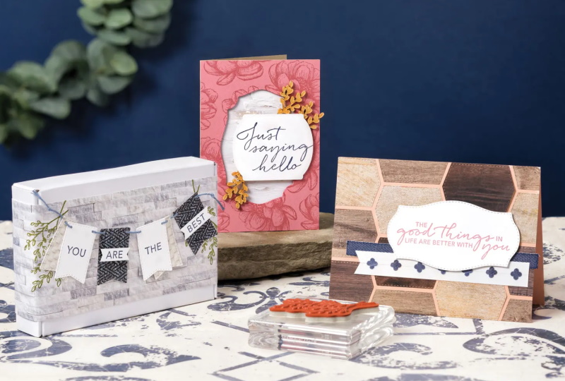 I’m using the stunning “Hand-Penned” designer paper again today, which is currently on sale at 15% off regular price. I’m also using the same cardstock and ribbon in Pale Papaya and the Genial Gems! I did this to show you another way to use the supplies you already have!!